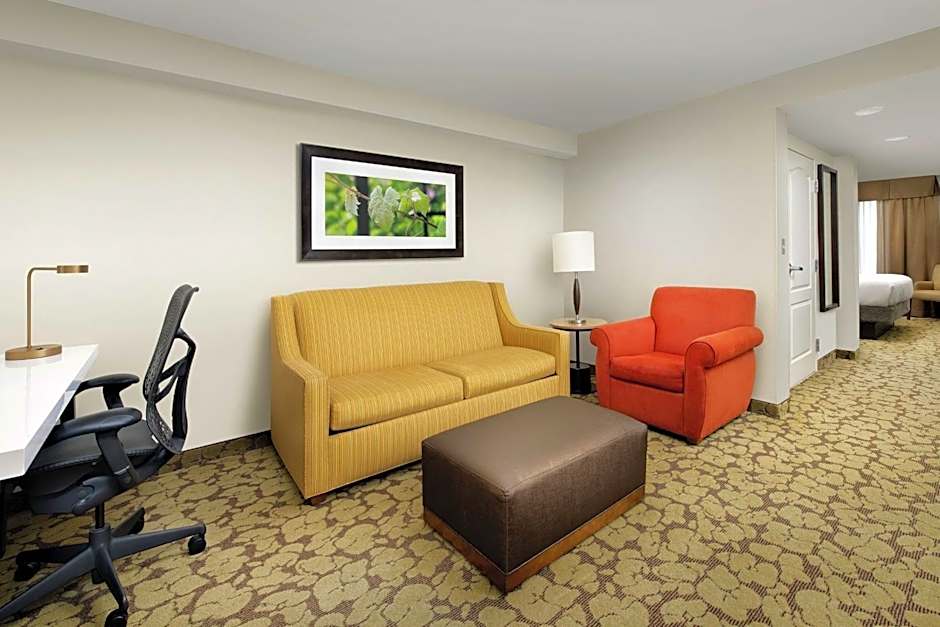 Features a separate seating area with a sofa bed, microwave and refrigerator.